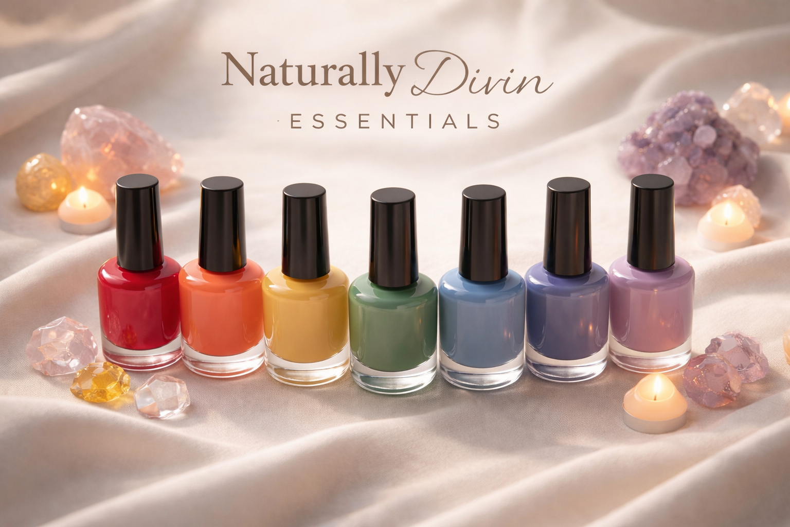 A luxurious flat-lay product image of a chakra-aligned nail polish ritual set. Seven nail polish bottles arranged in a subtle chakra arc, each bottle a muted, high-vibration chakra color. Soft neutral background with warm lighting, crystals subtly placed around the set, minimalistic and upscale aesthetic. Include a clean label reading “Naturally Divin Essentials” in elegant typography. No hands, no people, calm sacred energy, modern spiritual luxury style.